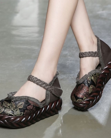 Women Ethnic Retro Style Floral Genuine Leather Pumps 2022 Spring