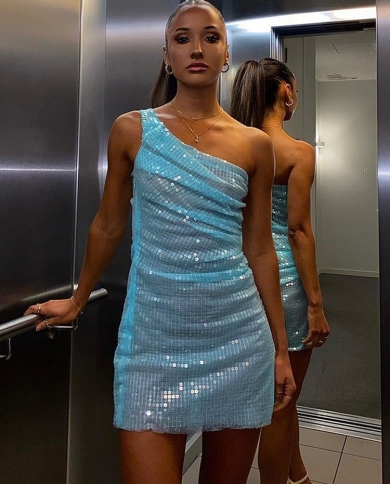 Blue Sequins Mini Dress For Women Fashion One Shoulder Slim