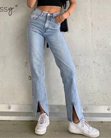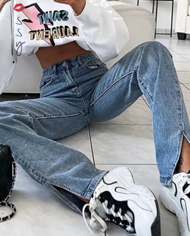 Women Bottom Split Out Jeans Casual Straight Leg Baggy