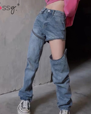 2022 Fashion Zipper Removable Jeans Women Straight Leg Trousers