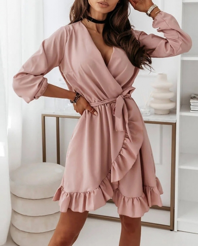 2022 Elegant V Neck Ruffle Pleated Mini Dress Casual Commute