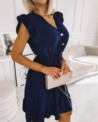 Women Elegant Ruffle V Neck Commute Dress Summer Casual Short