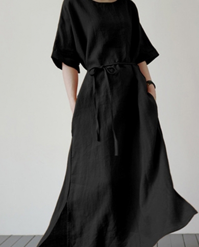 2022 Elegant Harajuku Loose Dress Autumn Cotton Linen Solid Color