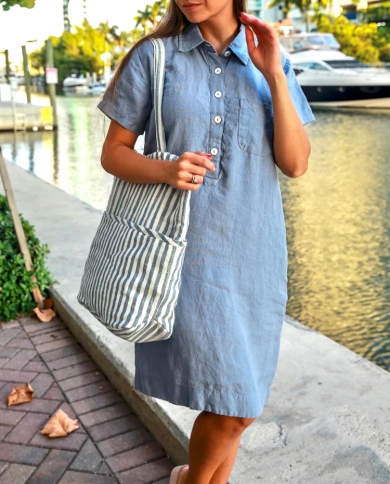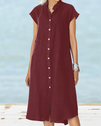 2022 Summer Women Loose Shirt Dress Cotton Linen Stand Collar