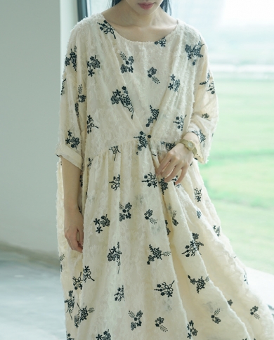 Beige Embroidered Loose Flowy Travel Cut Flower Long Dress