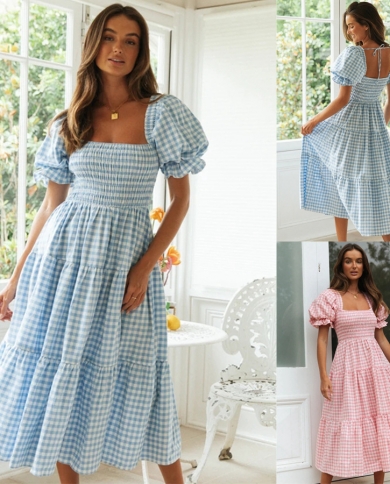 New Three Colors Short Sleeve Square Neck Check Dress
