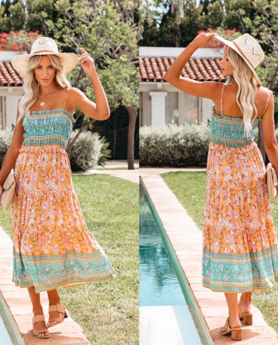 Summer Bohemian Flower Lotus Leaf Large Swing Suspender Dress