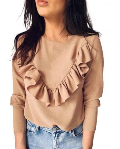 Lady Shirt Solid Color Flounce Edge O Neck Casual