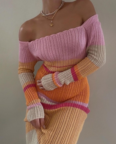 Hirigin Vintage Striped Knitted Long Dress Leisure Style