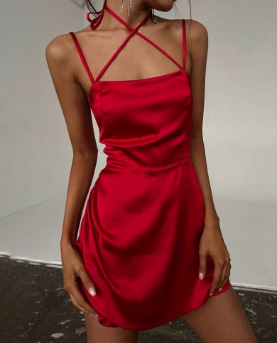 Hirigin Solid Chain Strap Satin Mini Dress Drawstring Lace
