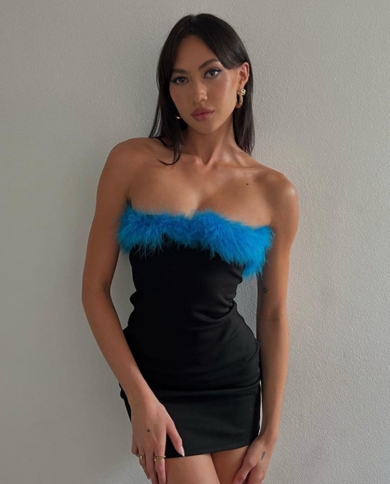 Hirigin Strapless Black Feather Mini Dress Party Backless