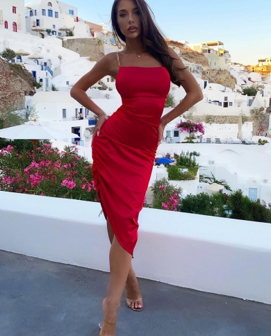Hirigin Lace Up Drawstring Ruched Chain Strap Midi Dress