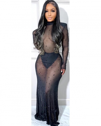 2022 New Fashion Perspective Bead Bodycon Maxi Dress Mesh