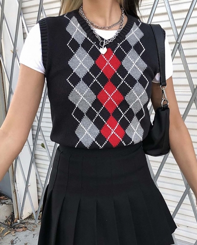 Plaid Knitted Vest Autumn Knitwear Tanks 2022 Fashion Preppy Style