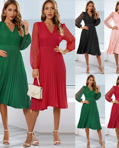 Autumn And Winter Womens New V-neck Long-sleeved Pleated A-line Skirt