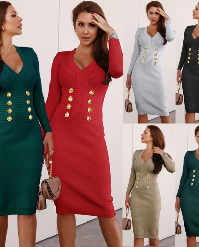 Slim Fit V-neck Double-breasted Knitted Sweater Dress Autumn And Winter