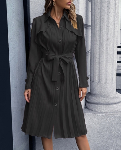 Fashion Casual Slim Fit Pleated Office Commuter Black Shirt Midi