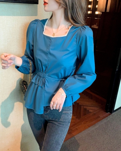 Autumn New Irregular Pearl Square Collar Top Womens Chiffon Shirt