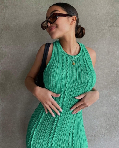 2022 Sleeveless O Neck Sweater Bodycon Crochet Solid Dress