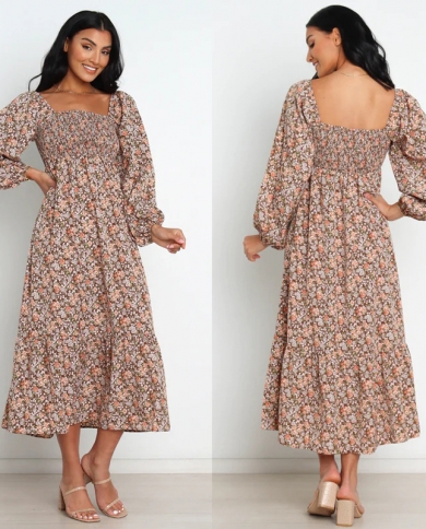 Womens Clothing Small Floral Square Collar Lantern Long-sleeved Dress