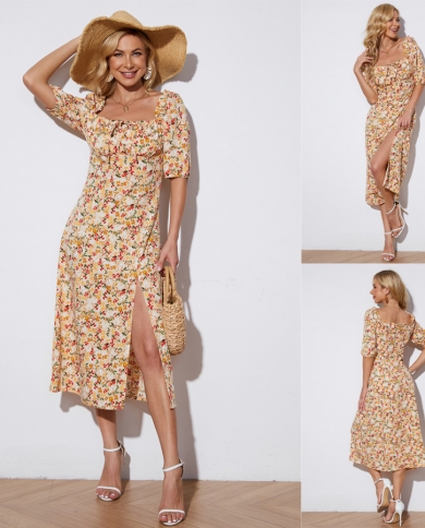 New Womens Short-sleeved Square-neck Hem Slit Dress