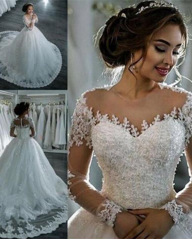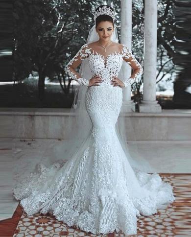 Luxury Womens Elegant Wedding Dresses Round Neck Lace Applique Mermaid