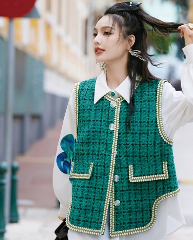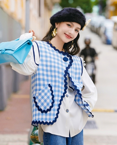 Blue Plaid Temperament Vest Early Autumn New Wave Neck Trimmed