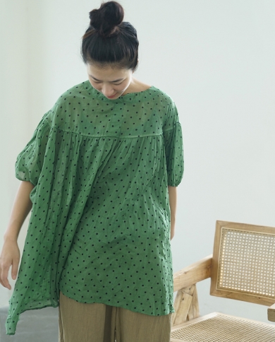 Retro Polka Dot Ramie Loose Mid-length Shirt Pastoral Dress