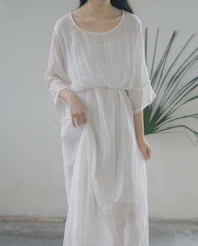 Light and Flowy Crinkled Linen Lace-Up Vintage Maxi Dress