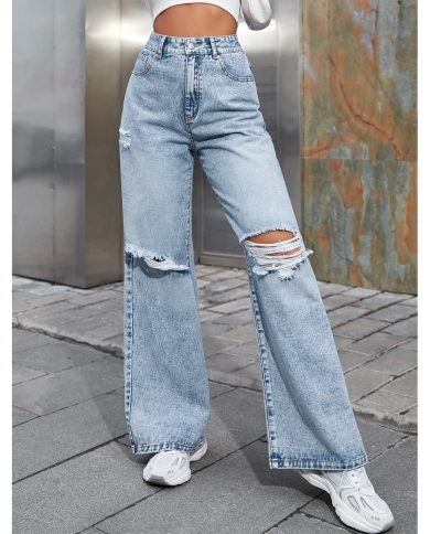 Womens Clothing Fashion Ripped High-waisted Wide-leg Pants Casual Denim Trousers