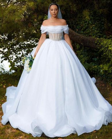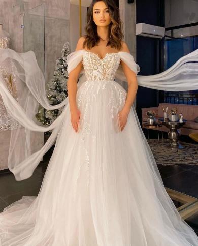White Off Shoulder A Line Wedding Dress Long Off Shoulder