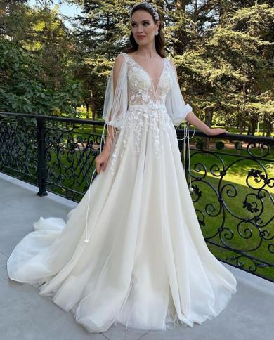 A Line Dress Long Sleeve Deep V Neck Wedding