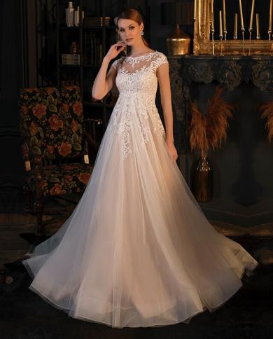 Beige Tulle Bridal Wedding Dress Fashion Elegant High Neck Lace