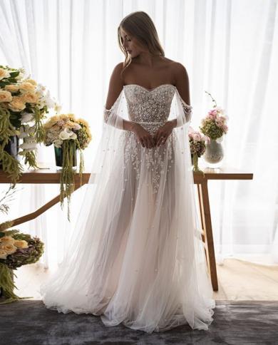 Boho Wedding Dress Off Shoulder Beaded Pearl Sparkling Applique Elegant