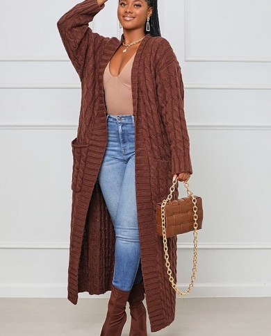Women Knit Ribbed Hemp Flower Long Sleeve With Pocket Open
