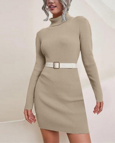 Ladies Autumn Winter Turtleneck Knitted Sweater Dress Solid Color Long