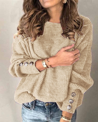 Women Sweater Pullovers Solid Color Buttons Long Sleeve Knitted Pullover