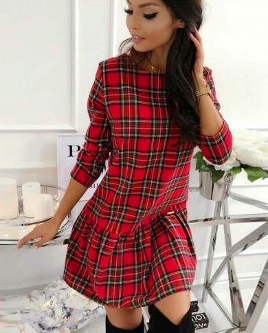 Autumn And Winter Women Short Dress Fashion Plaid Long Sleeves