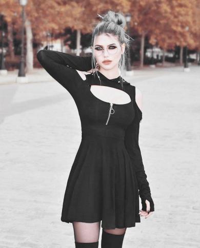 Black Gothic Dress Women Fashion Goth Pure Color Hooded Low