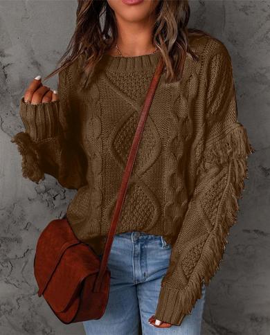 Womens Oversized Fuzzy Crewneck Tassel Long Sleeve Sweaters Casual Loose
