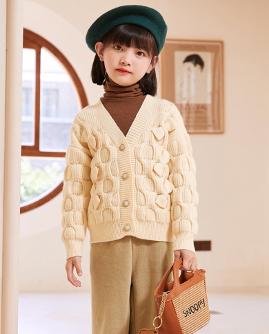 Girls Handmade Thick Twist Cardigan Bow Knit V-neck Sweater Jacket
