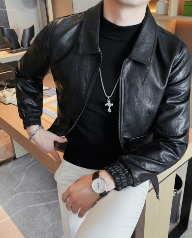 Mens New Leather Slim Fit Lapel Big Pocket Biker Windbreaker