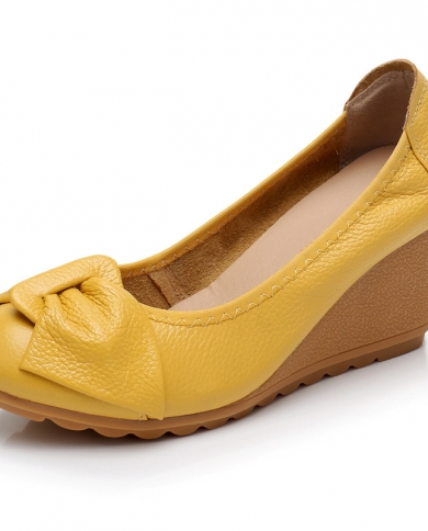 Genuine Cowhide Single Shoes Shallow Mouth Bow Wedge Shoes Soft