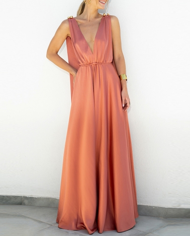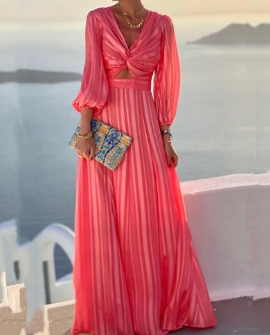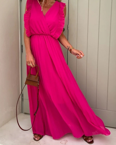 Deep Vneck Tieup Long Dress Summer Fashion Pleated Bow