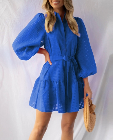 Women Lace Up Ruffle See Through Dress Elegant Casual Lapel