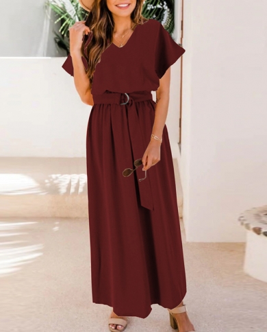 Elegant Summer Solid Short Sleeve Ruffle Dress V Neck