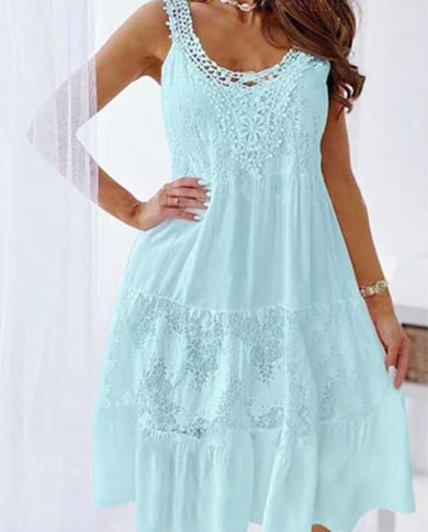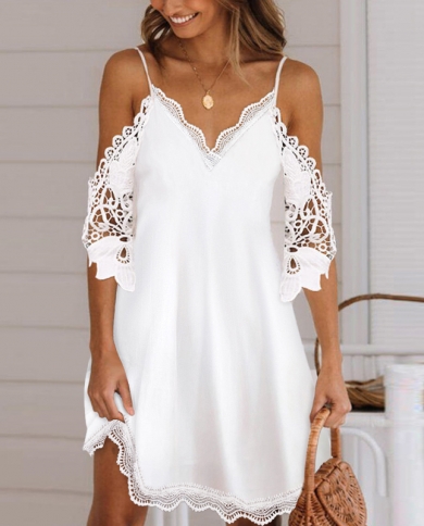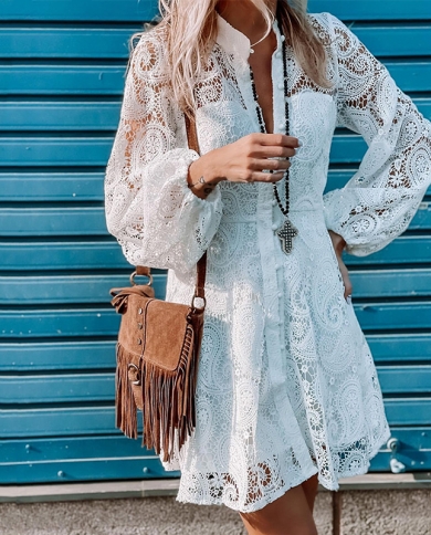 Solid V Neck Lace Party Dress Elegant Embroidery Crochet