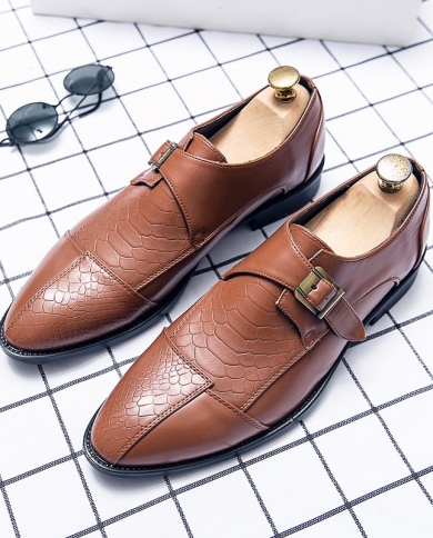 New Luxury Fashionn Pointed Crocodile Pattern Monk Strap Shoes Men